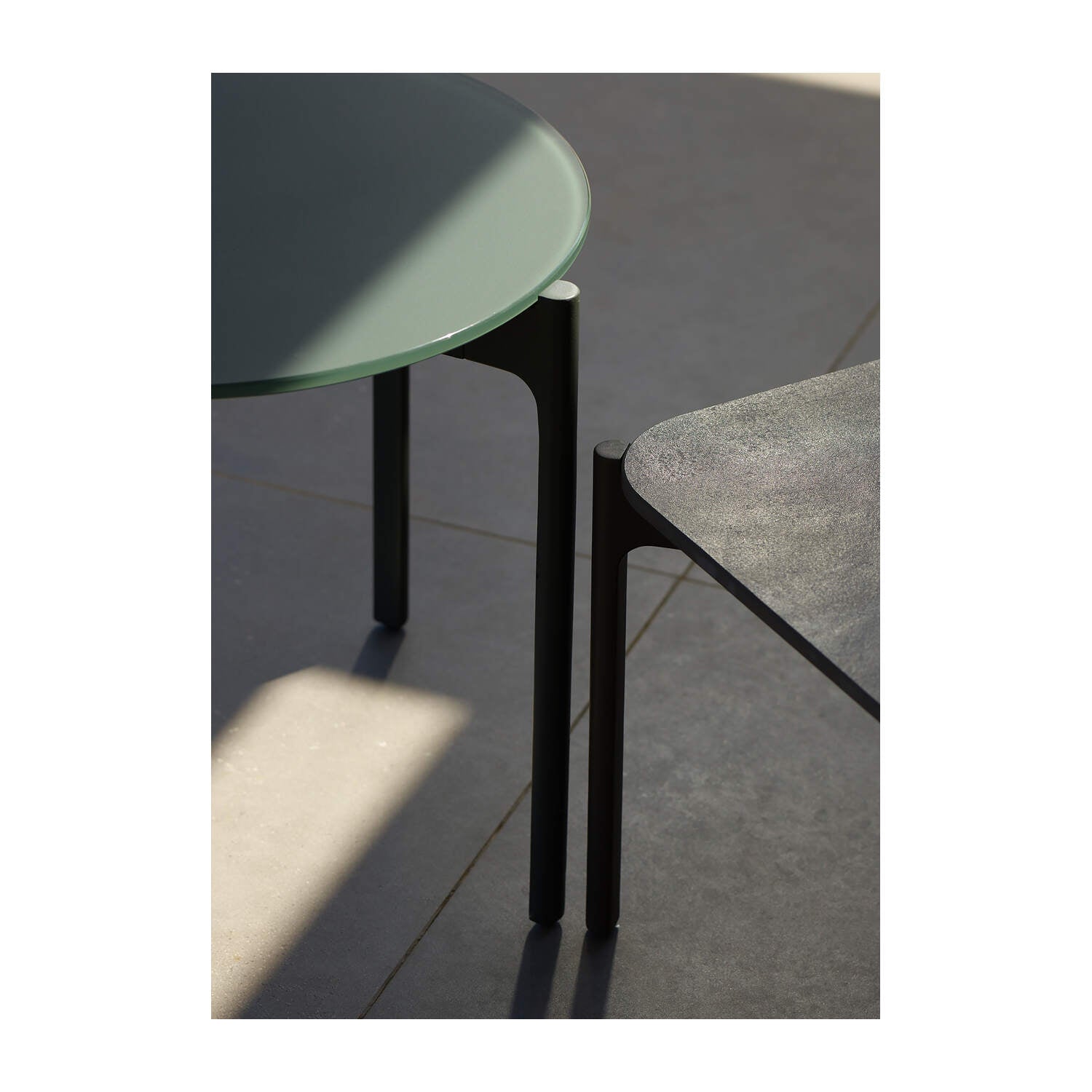 Die Tische der IZON Kollektion sind wahlweise mit einer, Glass, HPL oder einer Mineralkompositwerkstoff Tischplatte verfügbar.