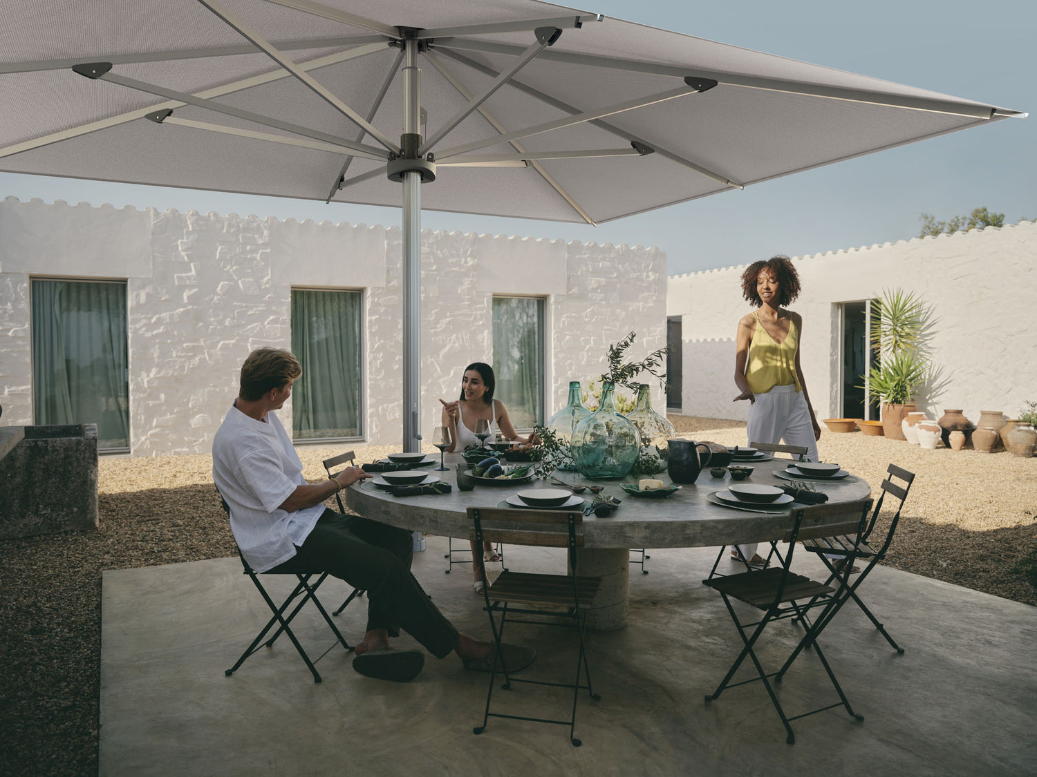 Flaches Schirmdach, hochwertige Materialien und perfekte Verarbeitung – ein modernes Highlight für jede Terrasse.
