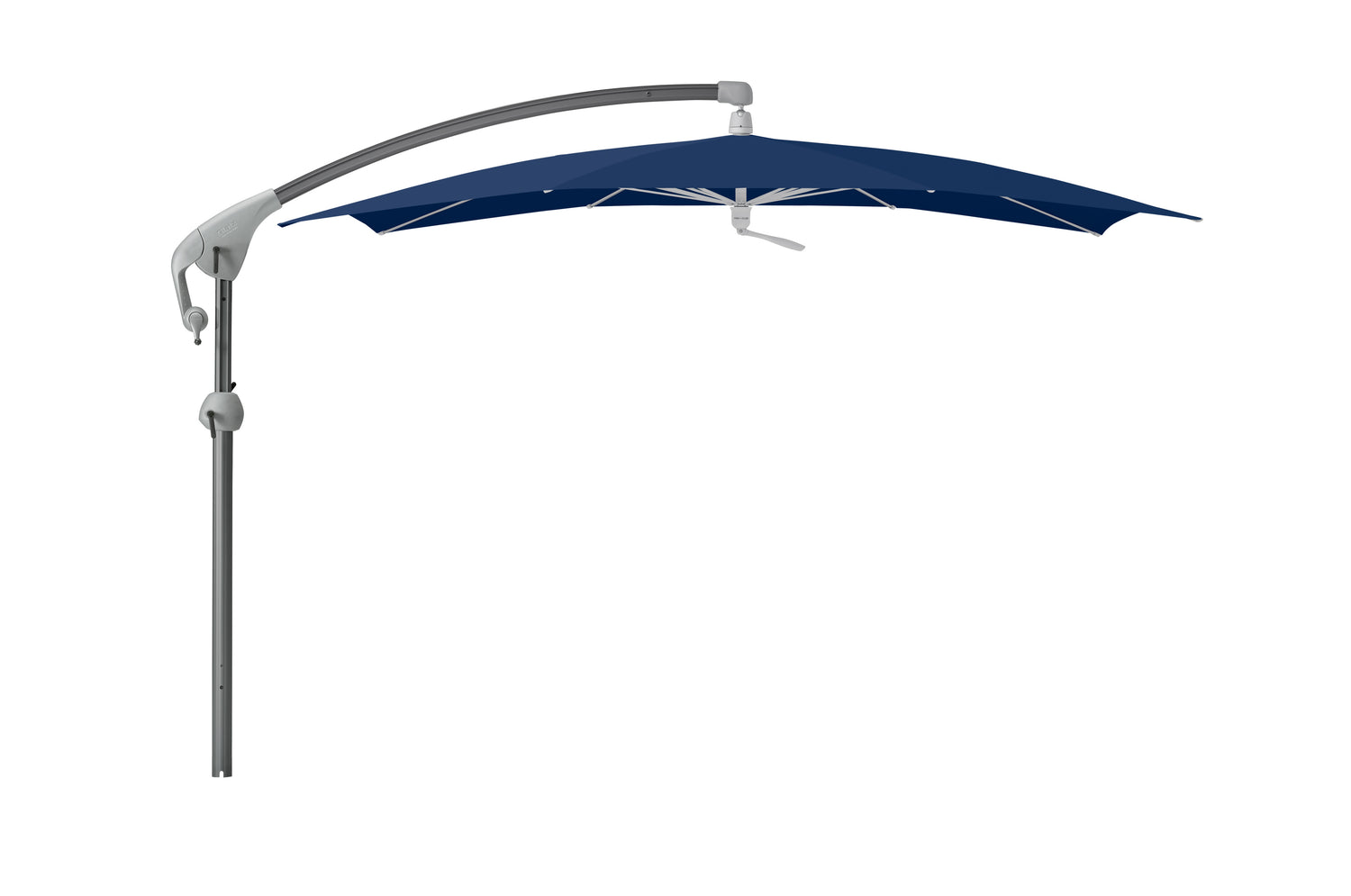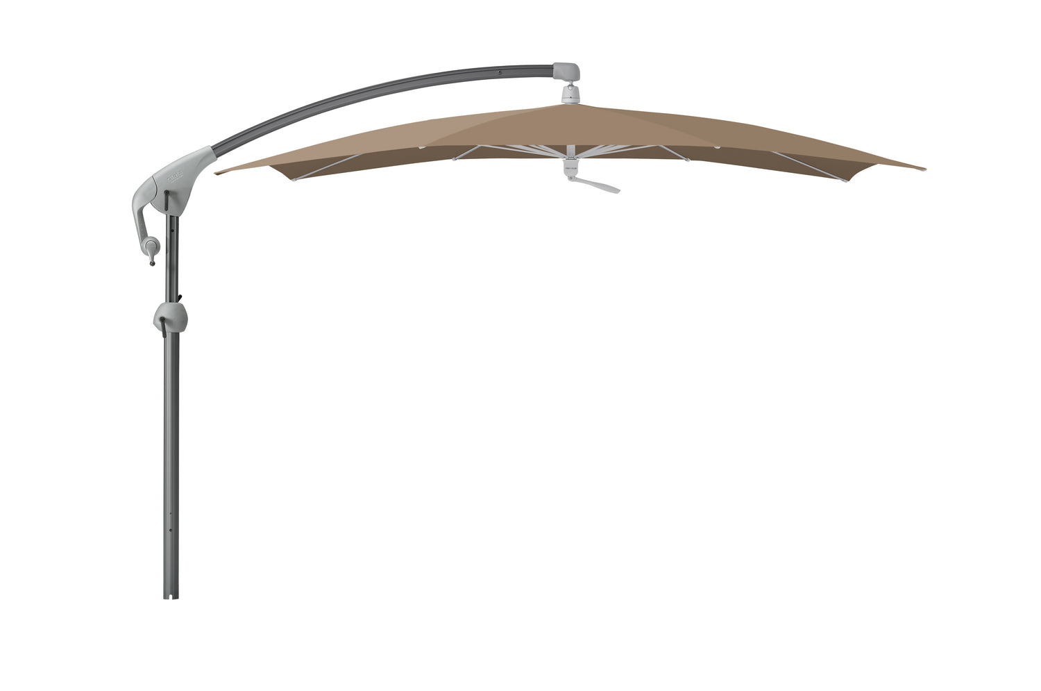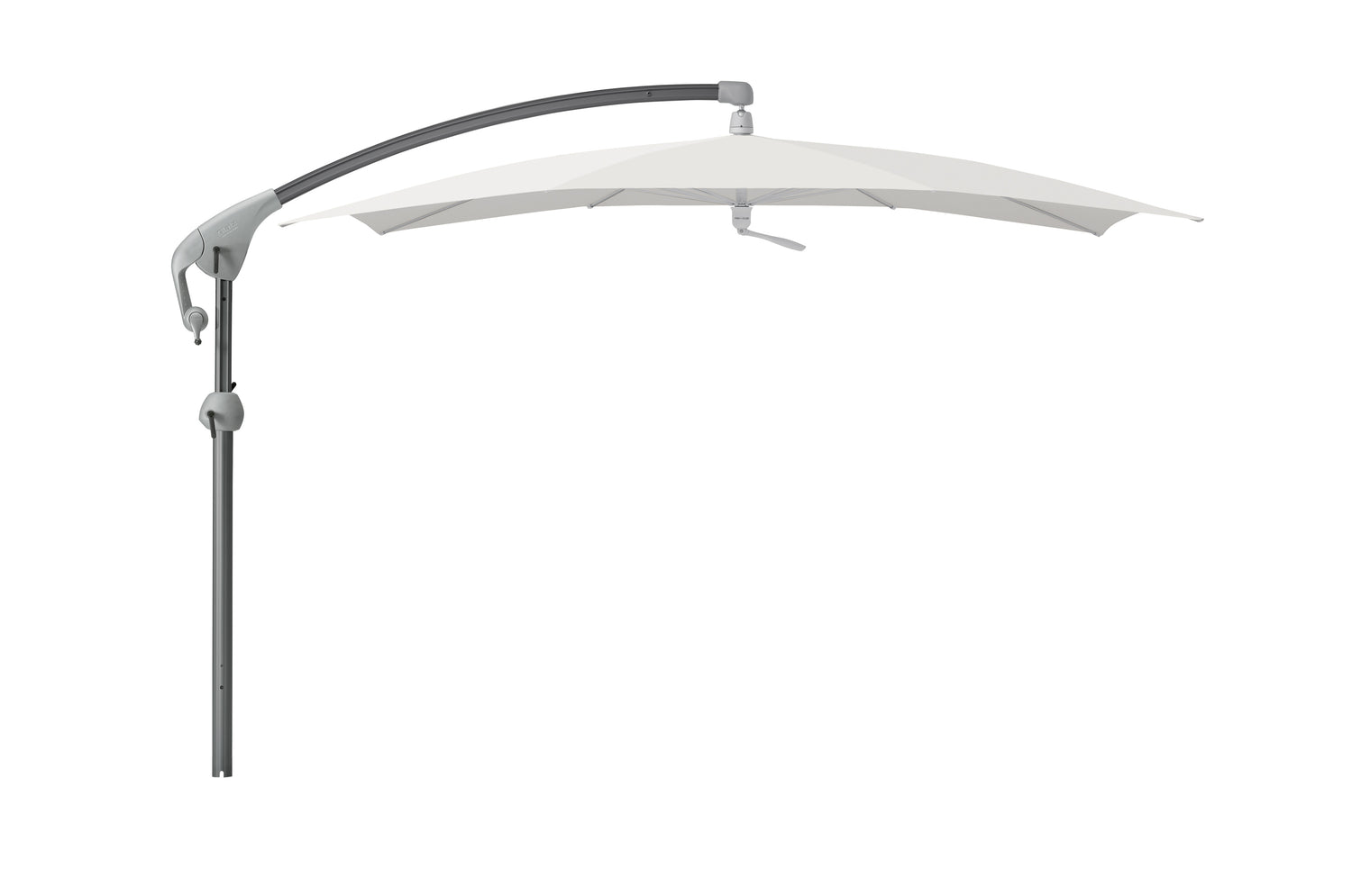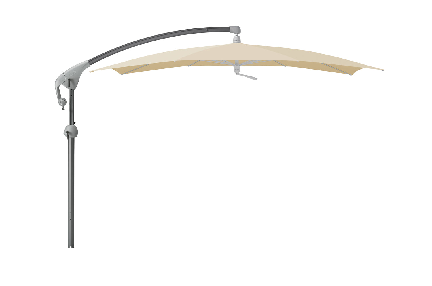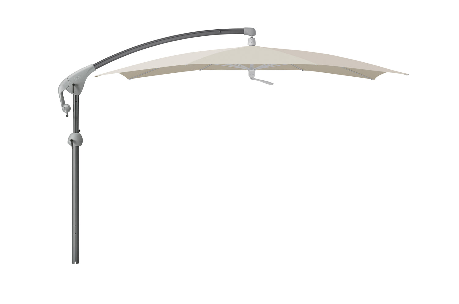 Der kugelgelagerte Drehfuß ermöglicht eine 360°-Drehung, während die leichtgängige Kurbelbedienung – für Rechts- und Linkshänder geeignet – das Öffnen und Schließen mühelos macht. Der elegante Aluminiummast kann platzsparend an der Tischecke positioniert werden und verleiht dem Schirm Stabilität und Leichtigkeit zugleich.
