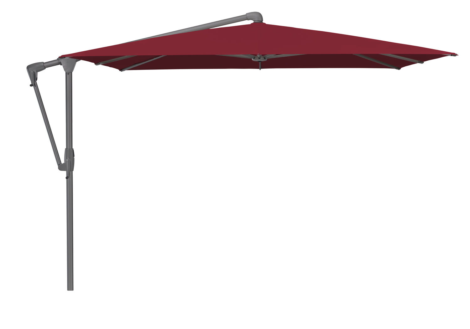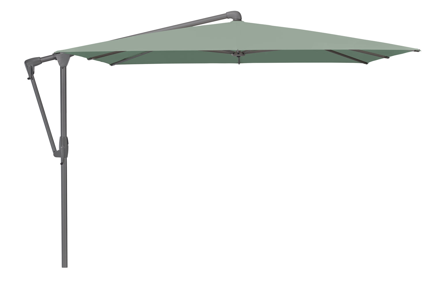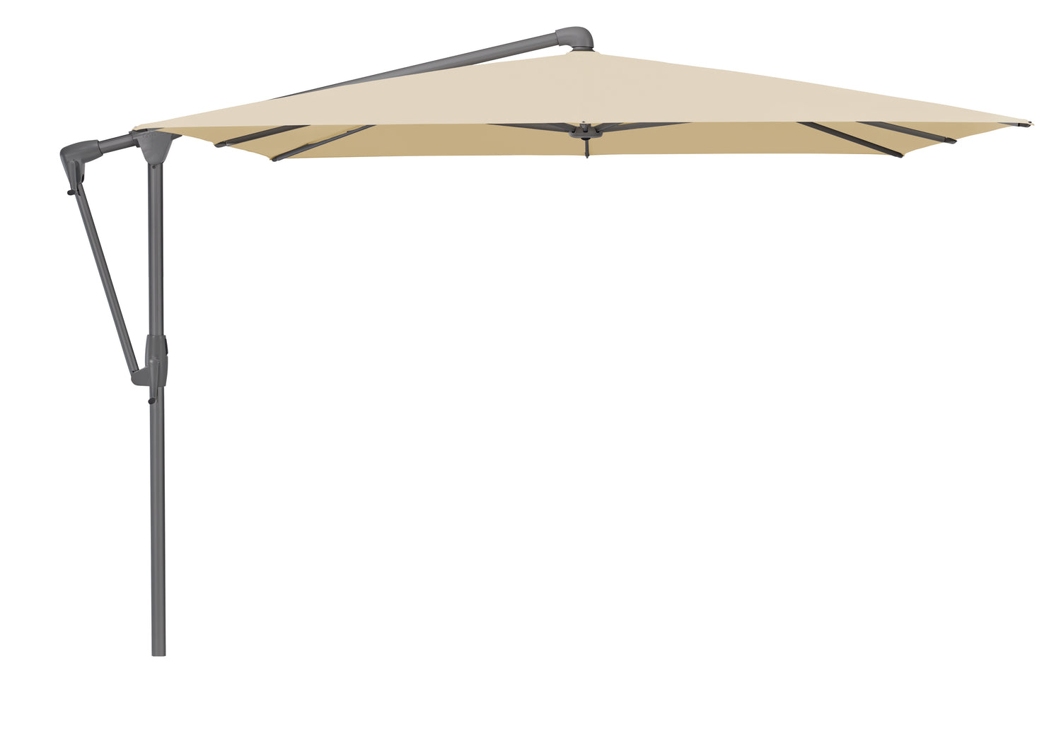 Der mittelgrosse Seitenmastschirm lässt sich mit einer Kurbel im Nu öffnen und mit der anderen beidseitig bis 45° neigen.