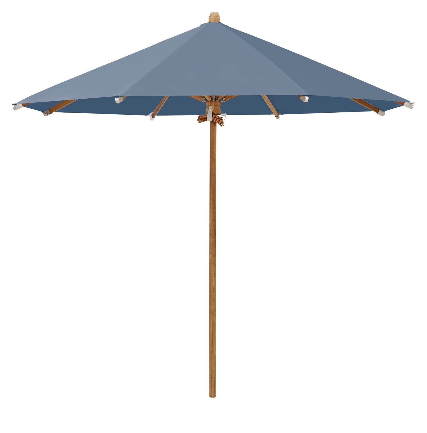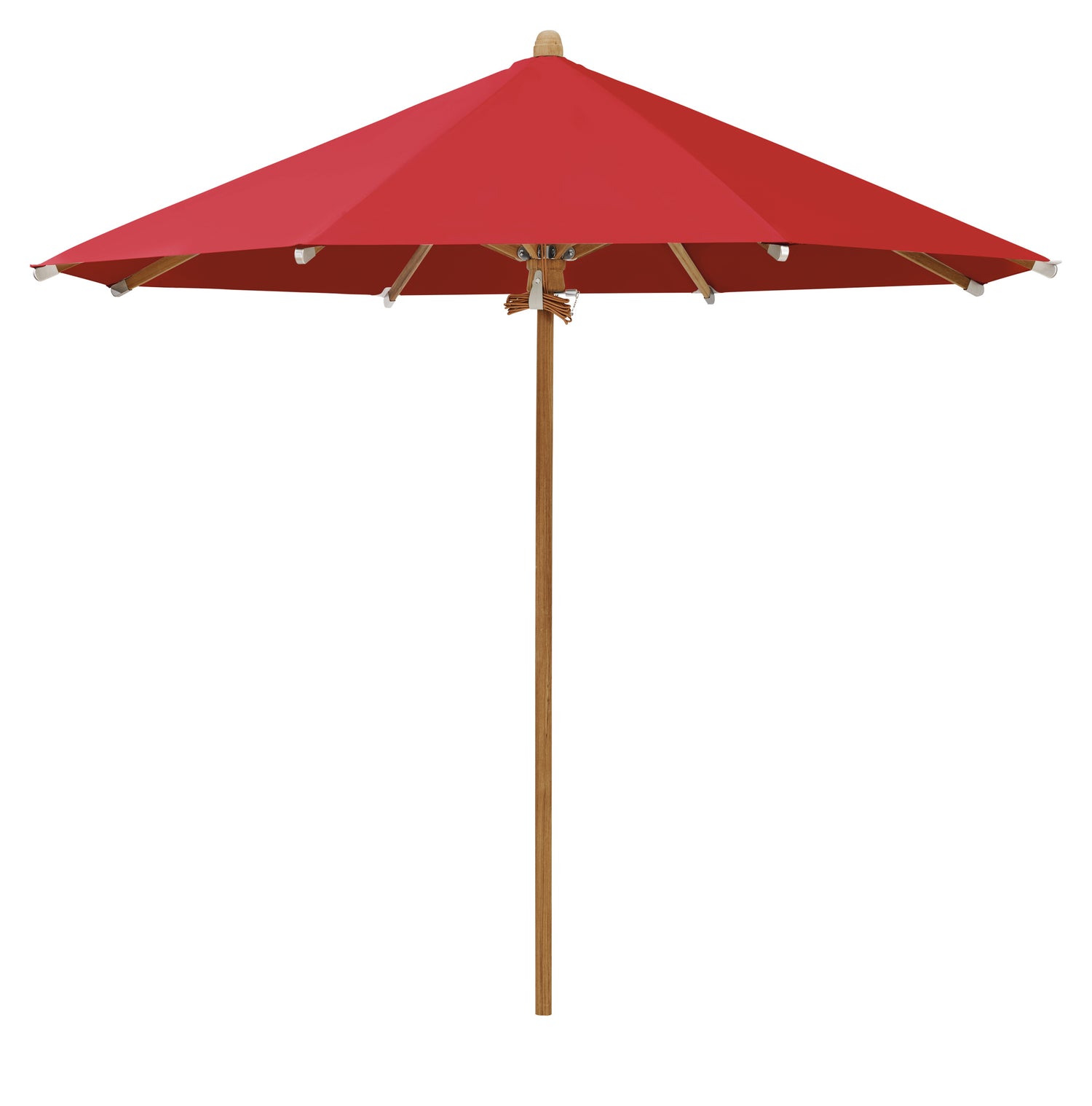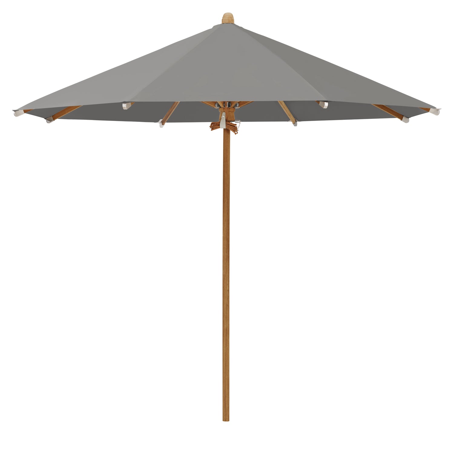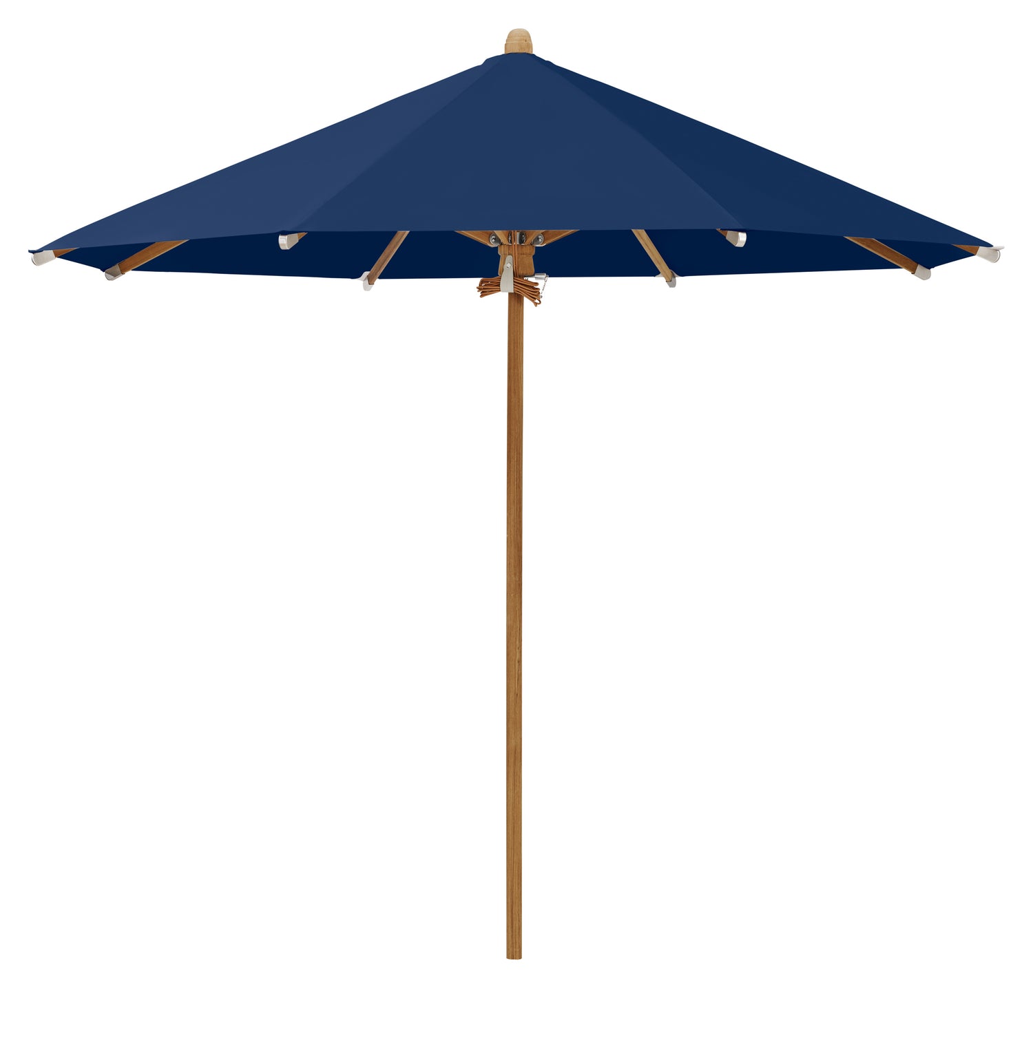 Teakwood ist der Rolls-Royce unter den Holzschirmen. Naturbelassenes Teakholz, hochwertige Lederlaschen zum Verstauen des Seils, doppelter Flaschenzug, lederverstärkte Stoffecken und schützende Metallkappen an den Strebenenden.